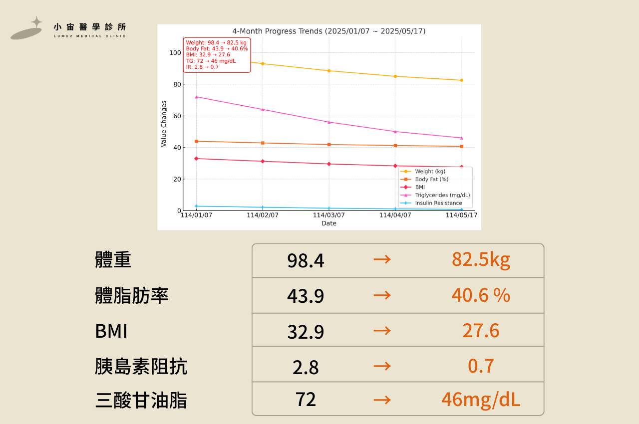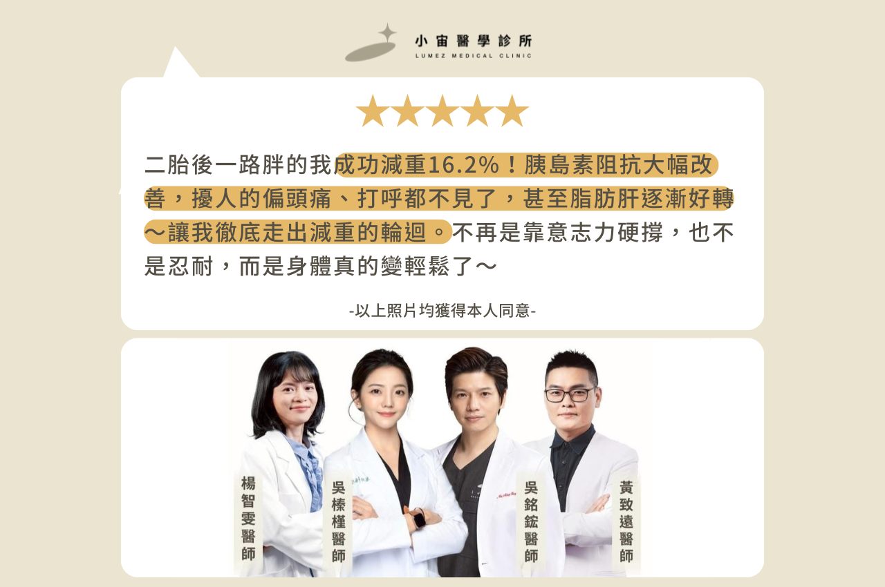 lumez 小宙醫美診所 > 案例分享 > 4個月減重16.2%!偏頭痛、打呼、脂肪肝也一起說掰掰~二胎後曾試過各種方法,卻始終「瘦了又胖」……